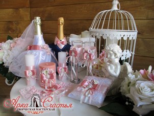 * Индивидуальное изготовление свадебной атрибутики ( семейный очаг, банк, бокалы, подушечка для колец и т.д.)